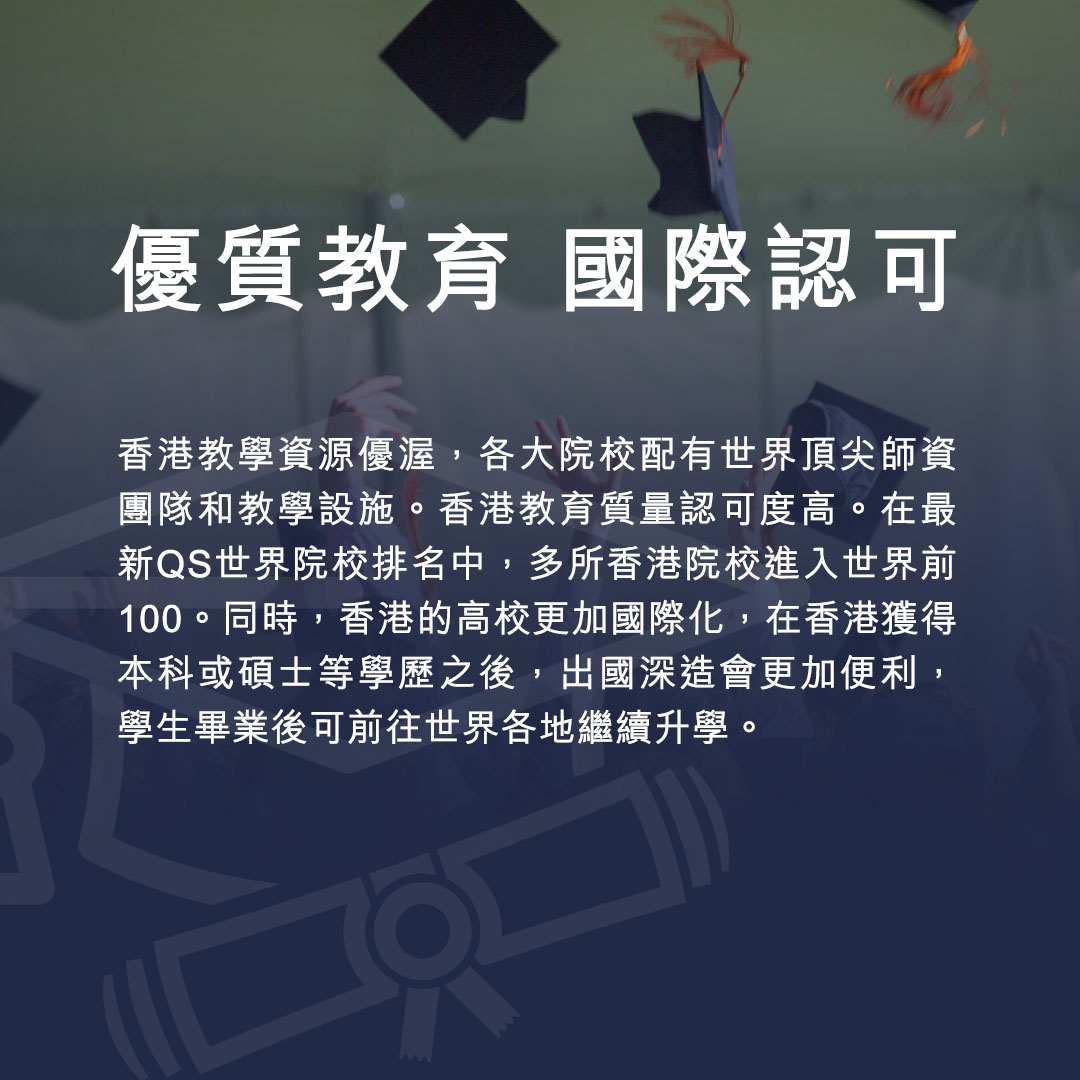 香港國貿留學交流 專注香港教育7年 國際高中 · 留學服務 · 定制方案 · 落地輔導 香港留學優勢 香港人氣大學排名及熱門專業 我們與港澳多家高校達成官方戰略合作,提供留學申請、學業輔導、港澳落地托管、國際高中及國際考試教學服務等。目前已經幫助6000+學生成功赴港留學。 % 副學士升學率 % 學士升學率 % 碩士升學率 PCE項目保錄取QS前100名校